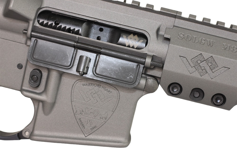 Chambered in 5.56mm NATO, the completely custom-built features the logos of Warriors Heart and Warriors Heart K9 – two organizations Warren acknowledges for aiding in his recovery and placement of his service dog.