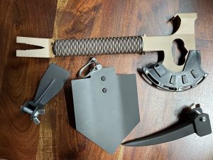 As the BV-Tac 8 tool incorporates multiple different-sized, and multi-use wrenches, a hammer, axe, pry bar, and gas turnoff into a single tool, the handle is wrapped with paracord that added additional uses. We split several small logs, split wood for kindling, threw it against a tree several times and it stood up just fine. Although we were not able to pry a door open, the wife frowned on this idea, we did use the shovel and although small as it is, dug holes just fine.