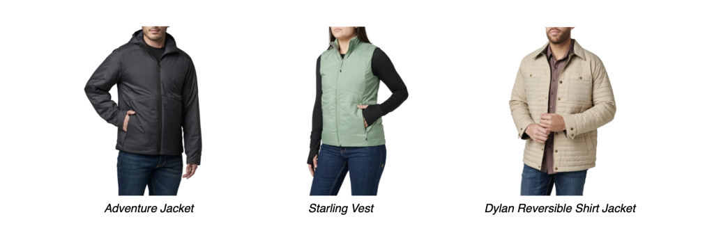 For those who favor vests, the Adventure PrimaLoft Insulated Vest ($98) and Starling PrimaLoft Insulated Vest ($98) are outstanding choices. The weather-resistant outer shells, backed by the warmth of 80 grams PrimaLoft® Gold Insulation, are perfect for cold-weather outings. A chin guard on the front zipper adds to the comfort while the adjustable hem with an internal shock cord ensures they stay in place. Zipper pockets and an internal dump pocket safely secure keys, a phone or other essentials, and reflective heat transfers keep users visible in lowlight conditions. Both items also stow inside a packable stuff sack, making them ideal for travel.